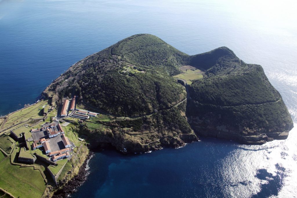 Rising beside the city stands the imposing Monte Brasil. It is the remnant of a collapsed cone of an ancient extinct volcano, formed from the sea, consisting of a caldera surrounded by four peaks: Pico das Cruzinhas, Pico do Facho, Pico da Quebrada, and Pico do Zimbreiro. It also helps shape Angra Bay to the east and Fanal Bay to the west.